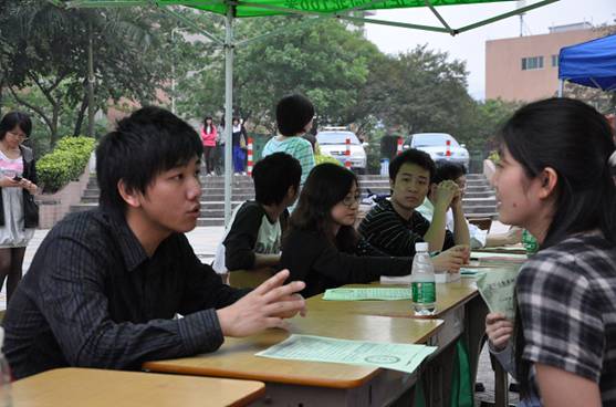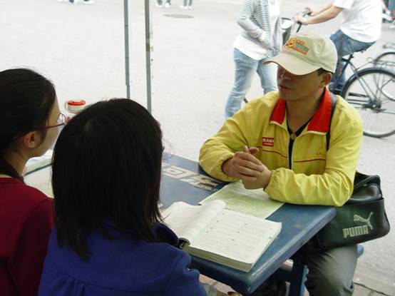 法律援助中心的业务人员在咨询点内为有需要的同学进行答疑。在咨询与宣传的过程当中,广外的外教James也现场秀了一翻功力,他手执中文宣传单张,迅捷地用英文翻译出来,其声音响亮清晰,引来了不少路人的注意力。