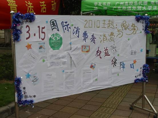 本网讯 2010年3月15日星期一是国际消费者权益日,广外法律援助中心、法学院团委学生会、法学院志愿者协会三方强强联手,在南北校同时举行主题为“消费与服务”的普法宣传活动。