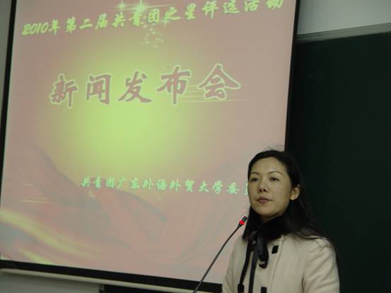 本网讯 3日9日下午18时30分,广东外语外贸大学校团委组织召开第二届“共青团之星”评选活动新闻发布会。学校团委副书记谢秀兰在会上详细解答记者问题,并表示欢迎广大同学对“共青团之星”评选活动提出宝贵的建议和意见。