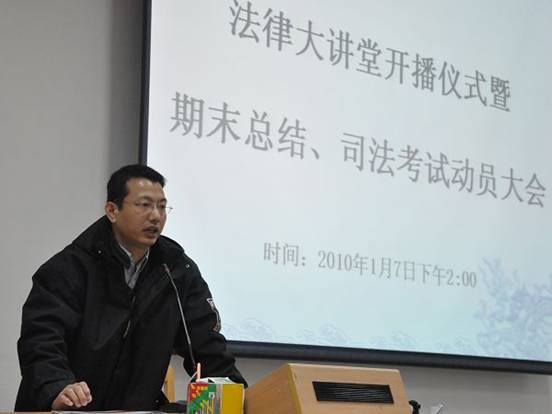 本网讯 2010年1月7日下午,我院在教学楼F208召开法律大讲堂开播仪式暨07级期末总结、司法考试动员大会。法学院副院长黄丽萍、院党委副书记卢海清、07级辅导员郭嫄就司法考试、法律大讲堂以及期末复习考试等有关事项讲话。与会嘉宾有北京新起点司法考试培训机构广州分校代表贺初开等。