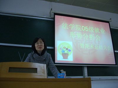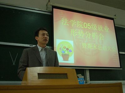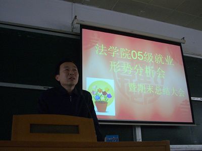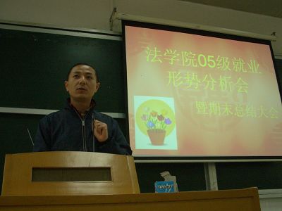 12月31日下午,法学院05级全体学生在北校区二教召开了就业形势分析大会。法学院党委书记金良成,党委副书记卢海清,副院长黄丽萍、陈寒溪出席了会议并分别发表讲话。会议由05级辅导员朱海龙主持。