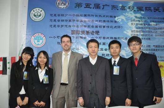 本网讯 12月27日,以“气候变化与全球环境可持续发展”为议题的“第五届高校国际关系论坛”在中山大学逸夫艺术文化中心举行。与会嘉宾有:中山大学亚太研究院副院长汪新生教授、暨南大学东南亚研究所庄礼伟教授、广东外语外贸大学法学院副院长陈寒溪副教授,以及美国驻广州领馆政治处副领事格里芬·安德鲁先生。王智鑫、郑瑜、钟致睿、郑文瑛四位同学代表我校参加了本届论坛,其中王智鑫、郑瑜获得“最佳行为体奖”,王智鑫同时获得“最佳个人风采奖”。