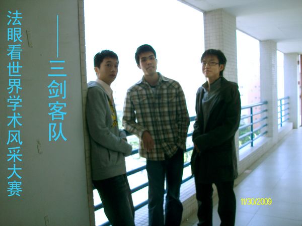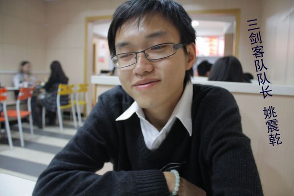个人简介:姚震乾,三剑客队队长。法学院08级法律2班学生,现任09级知识产权法班代理班主任,08级法律2班团支书,广外校党委宣传部新闻中心下属广外新闻网时事评论员。为人乐观好学,喜好钻研,尤其对民商法方向的法律法规比较感兴趣。希望将来能有机会在硕士研究生阶段研究民商法系的理论。立志成为一名律师。