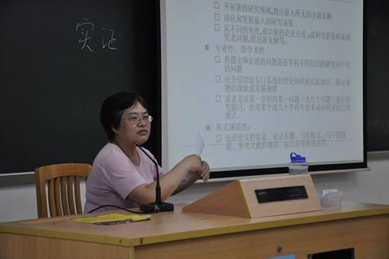 在论及学位论文的写作之前杨教授用精简的语言结合论文实例提出了期刊论文写作时文体格式及注释的重要性。紧接着,杨教授阐述了学位论文比之学术论文所具有的特点。杨教授花较大篇幅重点讲授了有关开题方面的内容。她指出同学们的误区并加以纠正。她指明选题宜小不宜大,应贴近生活实际并由此提出一系列建议。