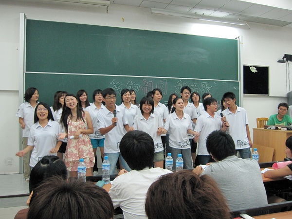 首先登场的09级新生激情澎湃,大胆献唱,《红旗飘飘》、《中国人》等经典曲目不断萦绕耳畔。虽然略带生涩和紧张,不少选手还几度忘词,但是评委包涵和观众的鼓励让他们慢慢进入状态。英姿飒爽的1号选手以一首铿锵有力的《精忠报国》使现场气氛迅速热起来;15号选手清越的《天路》博得满场喝彩;18号选手搞笑而充满激情的《抗美援朝》将现场气氛再度推向高潮……
