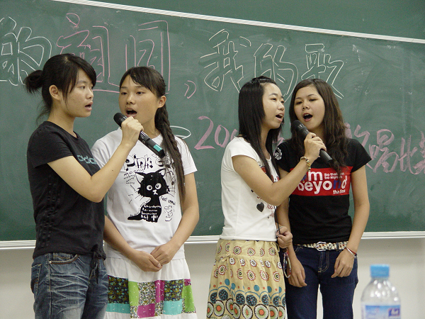 不少08级的选手演唱了赈灾歌曲,希望借着歌声,给遇难同胞送去温暖和祝福。08法二的王艺颖以一身淡雅的裙装亮相,一曲动人的《相信爱》让观众不襟想起地震中一双双洋溢希望和坚强的眼睛;08外交班的“外交12乐坊”以不同的风格,唱出同一份“承诺”,同一种祈祷,不同声部交替上演,歌声交织成一件纯白的薄纱,丝丝温暖沁入人心……