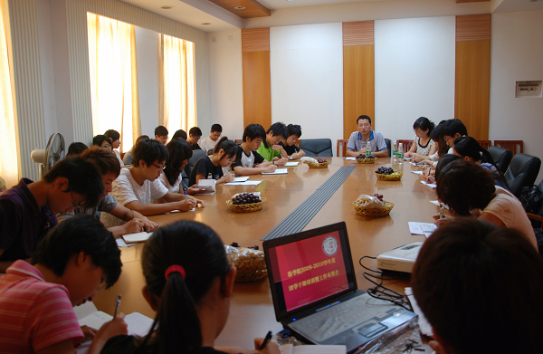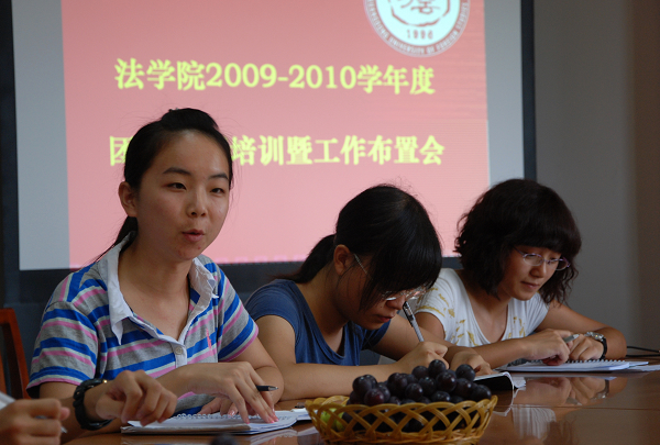 本网讯 2009年9月17日下午,法学院2009—2010学年度团学干部培训暨工作布置会在南校院系楼401举行,与会的有法学院党委金良成书记、院卢海清副书记、院团委书记郭嫄老师、08级辅导员高盈老师以及院所有团学干部。