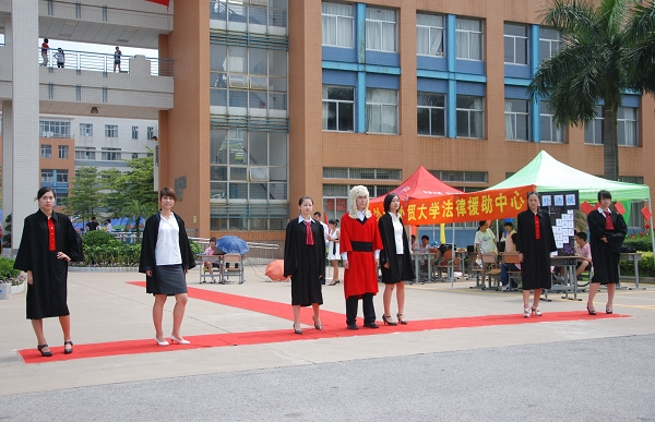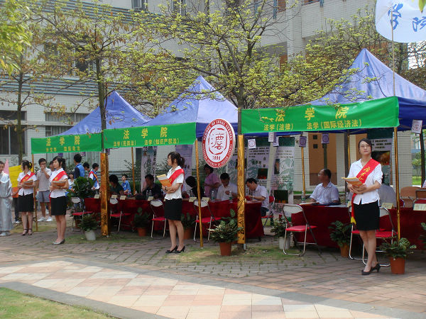 由法学院主办的广外大法律援助中心(以下简称法援中心)虽然还没有正式揭牌,但是法援中心的成员们都趁着开放日这个宣传的大好时机,在整个开放日中占了一席之地。他们打着“法扶正义,情暖人间,专业至诚,广外法援”的口号,配合着精彩的小案例,为刚来到广外大的家长和考生进行普法宣传,并努力宣传广外法学院的文化。