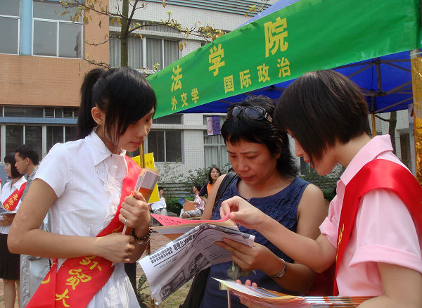 考生和家长们前来咨询,一般是奔学校学院的录取情况而来,因此,08年法学各专业的招生人数、录取分数情况和今年预测的分数录取线、招生人数便成为他们咨询的热门话题。其次,专业课程的设置和毕业后的去向及就业情况也是考生和家长关注的焦点。学院的专家教授的详细讲解和介绍,不但可以让考生和家长对所想要填报的专业有一定的了解,同时可以让他们慎重考虑各志愿之间的分数阶梯段,为他们在高考填报志愿中提供了良好的指南。