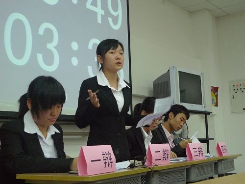 本网讯 4月29日晚7点30分,第一届法律文化节之2009法学院辩论赛在教学楼C308展开了冠亚军的角逐。本次决赛的评委由法学院法律系主任叶昌富和杨帆老师担任,法学院团委书记郭嫄作为嘉宾出席了比赛。