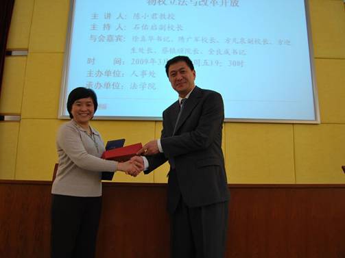 讲座开始前,隋广军为陈小君颁发聘书,聘任陈小君为本校客座教授。