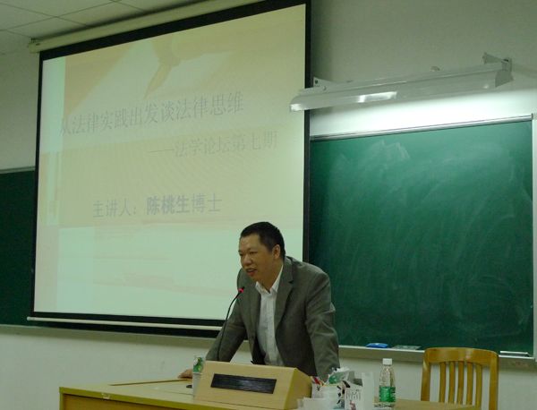 本网讯 11月14日晚7点,第七期法学论坛在教学楼E104举办,中国人民大学法学博士陈桃生作为本期论坛主讲人,他以其幽默的谈吐,深入浅出的分析,为大家带来了一场精彩的演说。本次论坛由法学院党委副书记卢海清主持,团委书记郭嫄出席本次论坛。