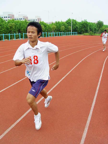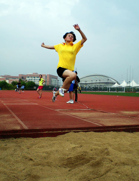 在男子跳远项目中,08法5的林炳雄用飘逸的动作为我们演示了“质量决定距离”的跳远理论,其轻盈的身影在空中划出了一道优美的弧线后站定在沙池中。而女子跳远项目的选手们也毫不示弱,最终王丽君与周夏菊双双夺冠。