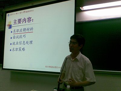 10月9日晚,我校就业指导中心主任徐昶斌老师应学院之邀,在百忙之中抽空为我院05级学生召开了一场题为“求职行动从现在开始——与毕业生畅谈简历制作”的讲座。讲座在北校区一教601举行,朱海龙老师担任主持人。