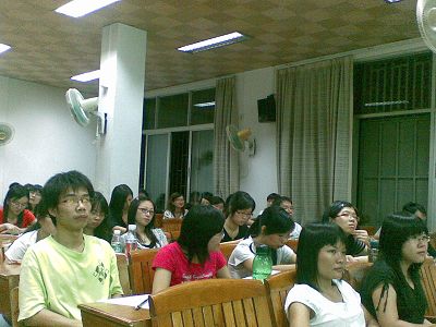 讲座开始前,徐昶斌老师与05级学生们探讨了近期大家颇为关注的公务员考试的问题。徐老师认为我校学生的综合素质很高。面对竞争激烈的公务员考试,同学们可以大胆报考,不论结果如何都会有一定的收获。他建议同学们报考前先咨询老师的意见,报考时也不要盲从,应该找准自己的位置。