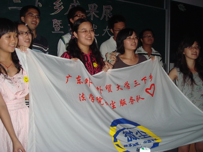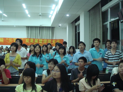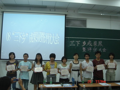 9月26日晚,法学院08年三下乡成果展示兼评优大会在南校区F207举行,法学院的八支队伍用精彩的视频和表演展示了各自的经历。最终,来自06法学一班的“爱飞扬”代表队脱颖而出,勇获一等奖。