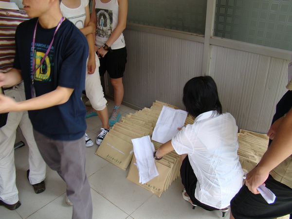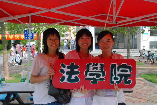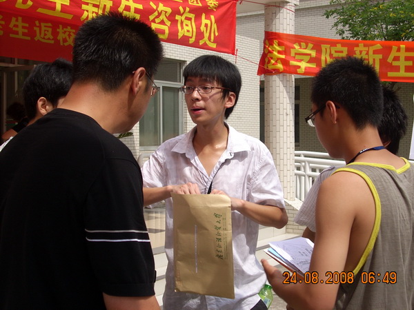 暑假的慵懒让他们多么留恋床上的安逸,然而清晨6点的校道上,美丽的身影早已忙碌。学生公寓一栋架空层里,一排排整齐的档案是志愿者们辛勤工作的结晶;签到处、资料领取处、一卡通领取处、户口办理处、绿色通道,志愿者们都已做好最充分的准备。校道上法学院的咨询处,志愿者们耐心地为新生解答疑问,并引导他们到达学院报到点。