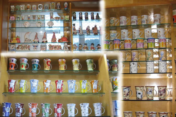 到达该厂后,我们一踏入会议室,大家都情不自禁叫了出来,会议墙边架子上摆着各式各样、多彩缤彩的杯子和其它一些瓷器,实在是太漂亮了!