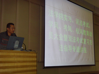 随后范利平老师上台做了司法考试的动员讲话。她认为这次大三同学可以报考司法考试是一大喜讯,应该抓住机遇,要有必胜的信心。同时,学院为了尽最大的努力帮助同学们通过司法考试,学院准备开办暑期的“广外司法考试培训班”,以提供全面的,针对性的复习,范老师认为如果条件许可,大家可以认真考虑。