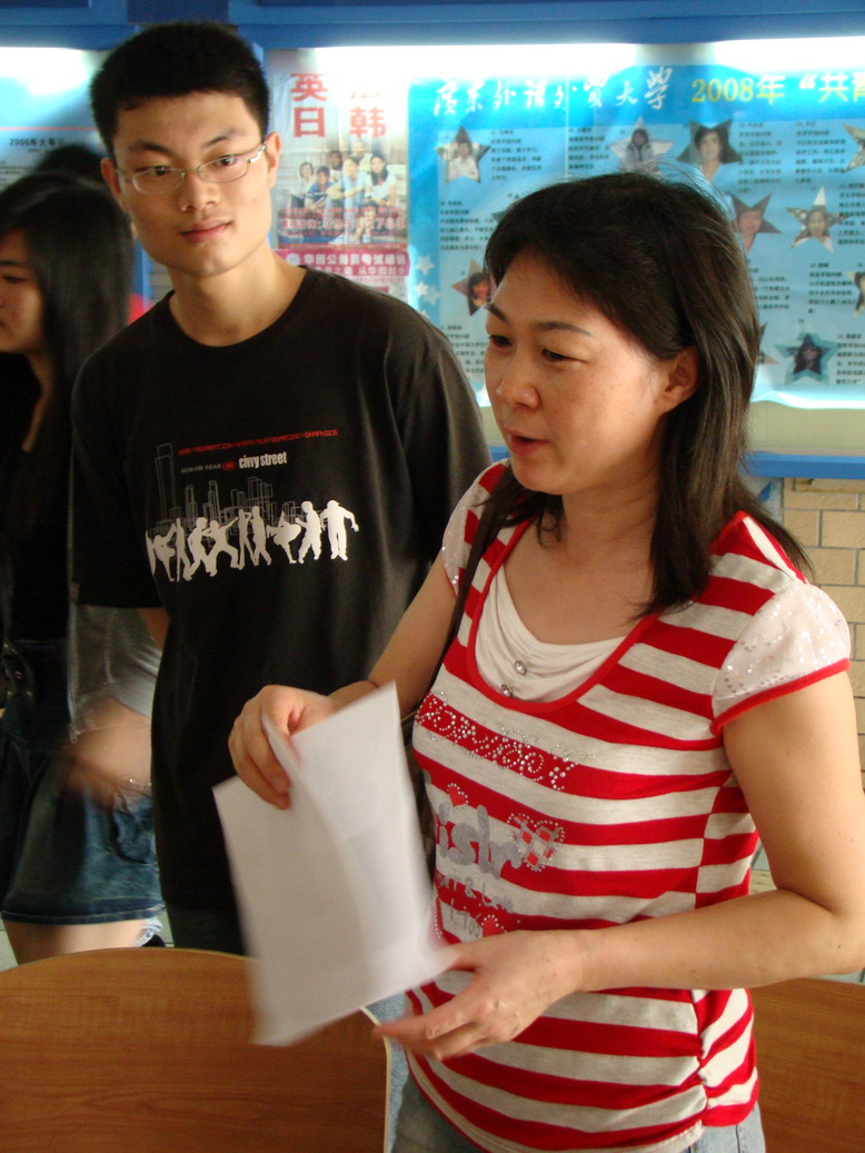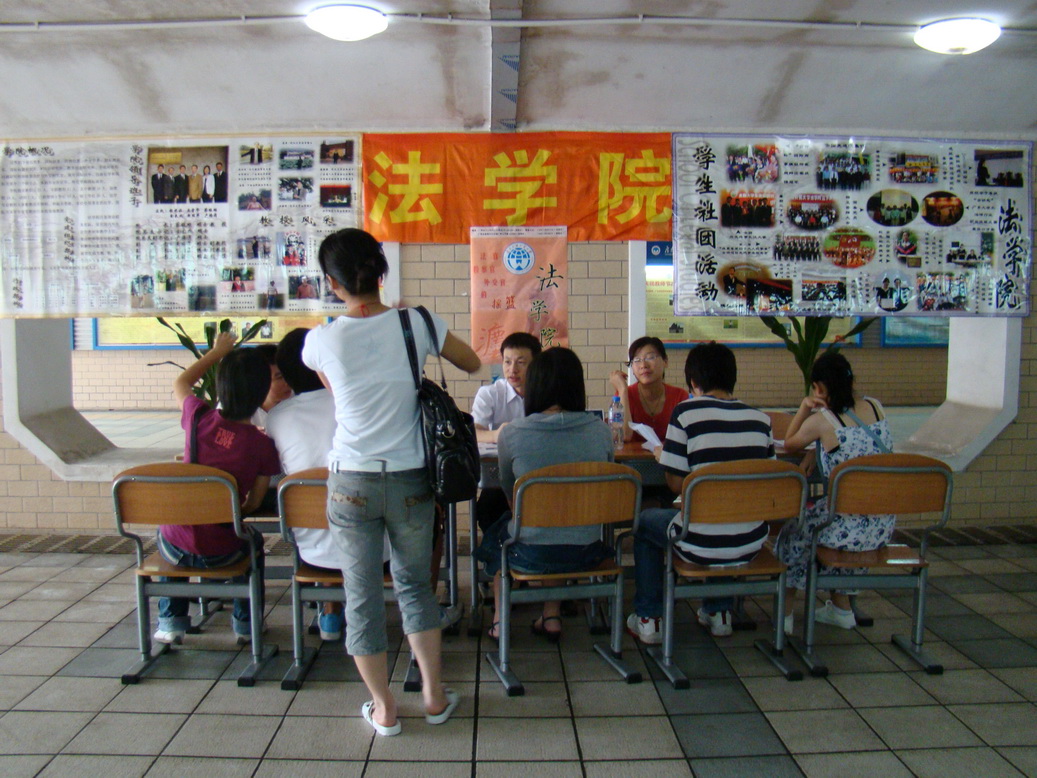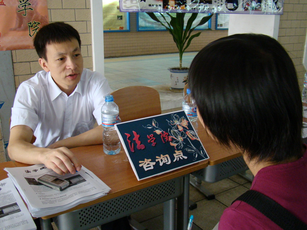 在采访过程中,一位家长陪同孩子急冲冲来到法学院的咨询点。她向院长询问了法学院开设的专业以及各专业去年的录取分数。家长希望能够尽量掌握详尽的信息,让孩子能报考到理想的大学。在领取了一份《法学院动态》的资料后,家长和孩子又赶往北区的主场。