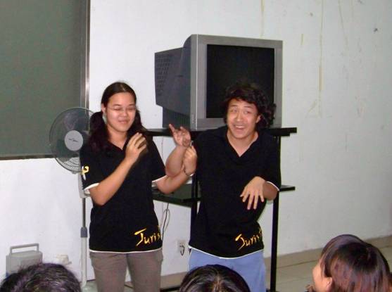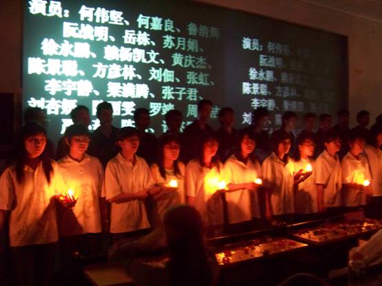 07级法学四班则以关注民生为主题,在《奔跑》的歌声中,在烛光闪闪的场景中,朴素但又感人的展示掀起了现场的高潮。