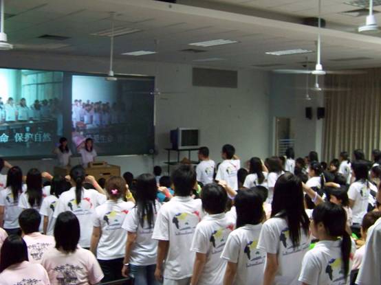 在经历过后,他们翻开相册,07级国政班在大屏幕上回放着属于这个家的回忆。最后,这个和谐的大家庭的每位成员都在现场举起右手宣誓——热爱生命,保护自然。