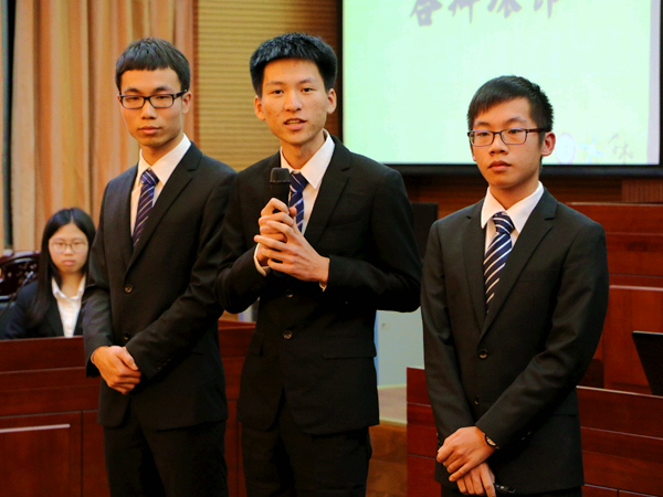 来自start dash队的三位同学给评委和观众留下了深刻的印象。他们以支付宝为例,浅析“第三方支付中沉淀资金产生的孳息归属”问题。首先,他们以情景对话的形式开始展示,令人眼前一亮。之后,他们从我国的法律规范出发,层层分析,最终提出了三条建议,获得评委老师赞赏。