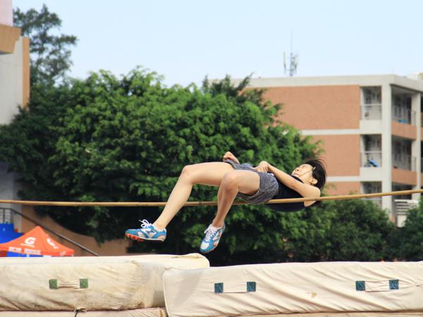 跳高是一项很挑战人的弹跳力和灵活性的运动。在女子组跳高中,运动员甄智贤给我们带来的一场精彩的赛事。一开始甄智贤便选择了1.1米的高,轻松跳过之后便“休养生息”,保存体力。第二次跳的高度为1.25米。她起步稳,跨步大,接近目的地便加速前进,然后轻松一跳,横杆丝毫没动,顺利过关。最后她以1.39米的佳绩夺得女子学生组跳高第二名。这位每年都参加比赛且获奖的大四师姐赛后表示,凡事要尽力,尽力就好。