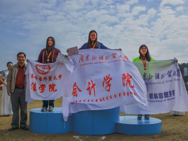 历经两天的激烈角逐,在喝彩声声中迎来了2015年广东外语外贸大学校运会闭幕式,校党委副书记卢景辉以及各单位领导出席此次闭幕式。首先,卢景辉致闭幕词。他表示,经过两天紧张激烈的比赛,2015年广东外语外贸大学运动会在组委会的精心安排下,在全体师生员工的辛勤工作下,圆满完成了各项比赛任务。在此,他向比赛中不断超越自我、顽强拼搏的运动员们致以崇高的敬意,向付出辛勤劳动的员工表示衷心的感谢。他表示,“在此次运动会,大家团结协作,奋力拼搏,敢于争先,弘扬了更高、更快、更强的奥运精神,取得了一项又一项优异的成绩”。他还倡导大家加强锻炼,增强体质,发扬运动场上的不畏困难的精神,发奋实践争取早日成为双高、两强、具有国际视野、通晓国际知识的国际化人才。在本届运动会,法学院表现优异,选手奋勇争先,超越自我,不断创新,积极求索,取得骄人成绩。最后,卢景辉宣布2015年广东外语外贸大学运动会闭幕。