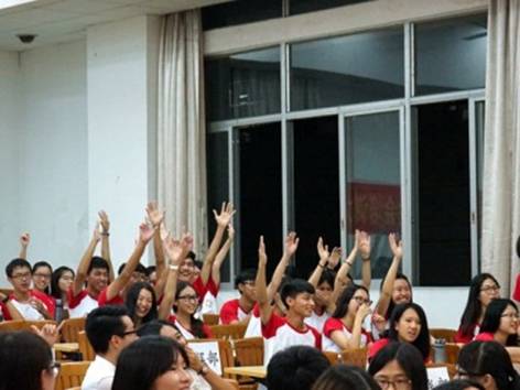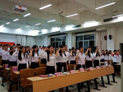 庄严的宣誓仪式开始了。全体人员举起了他们的右手,跟着领誓人、学生会副主席林梓博郑重地宣誓志愿加入广东外语外贸大学法学院团委学生会,谨遵携手于诚,致乐于朋的精神。