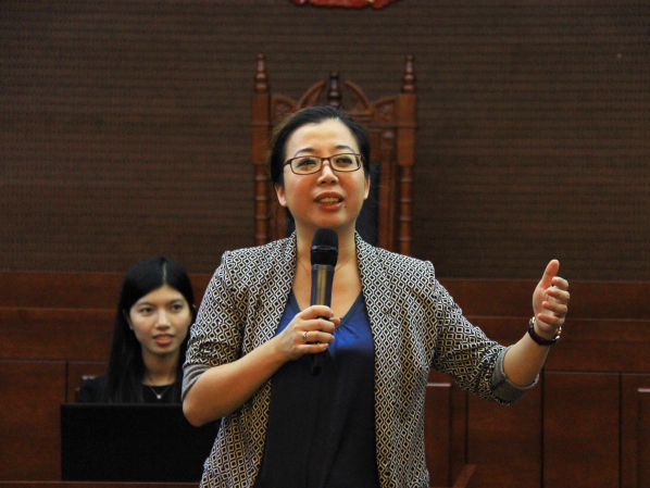 紧随其后的是97级翟彩娟师姐——盈科(广州)律师事务所的高级合伙人之一,她轻松自如地走向台中,打趣说到:“我好紧张。”引来台下观众善意的笑声。首先,师姐坦白说道,重走校园,“十分有感觉”,同时也回忆起了学生时代的经历。透露着知性美却又气场十足的她用PPT和清晰的演讲让我们懂得了大学里要做什么,为什么要做以及怎么做。她坚信,想要得到什么,就去专注做什么。人做事情一定要听从本心,忠于自己。随后,她提出了“步入职场,需要提高自身各项素质。”临近结尾时,鼓励大学生勇敢追求爱情的她说:“如果你遇到那个人,其他人都成为了将就。”现场观众鼓掌赞同。