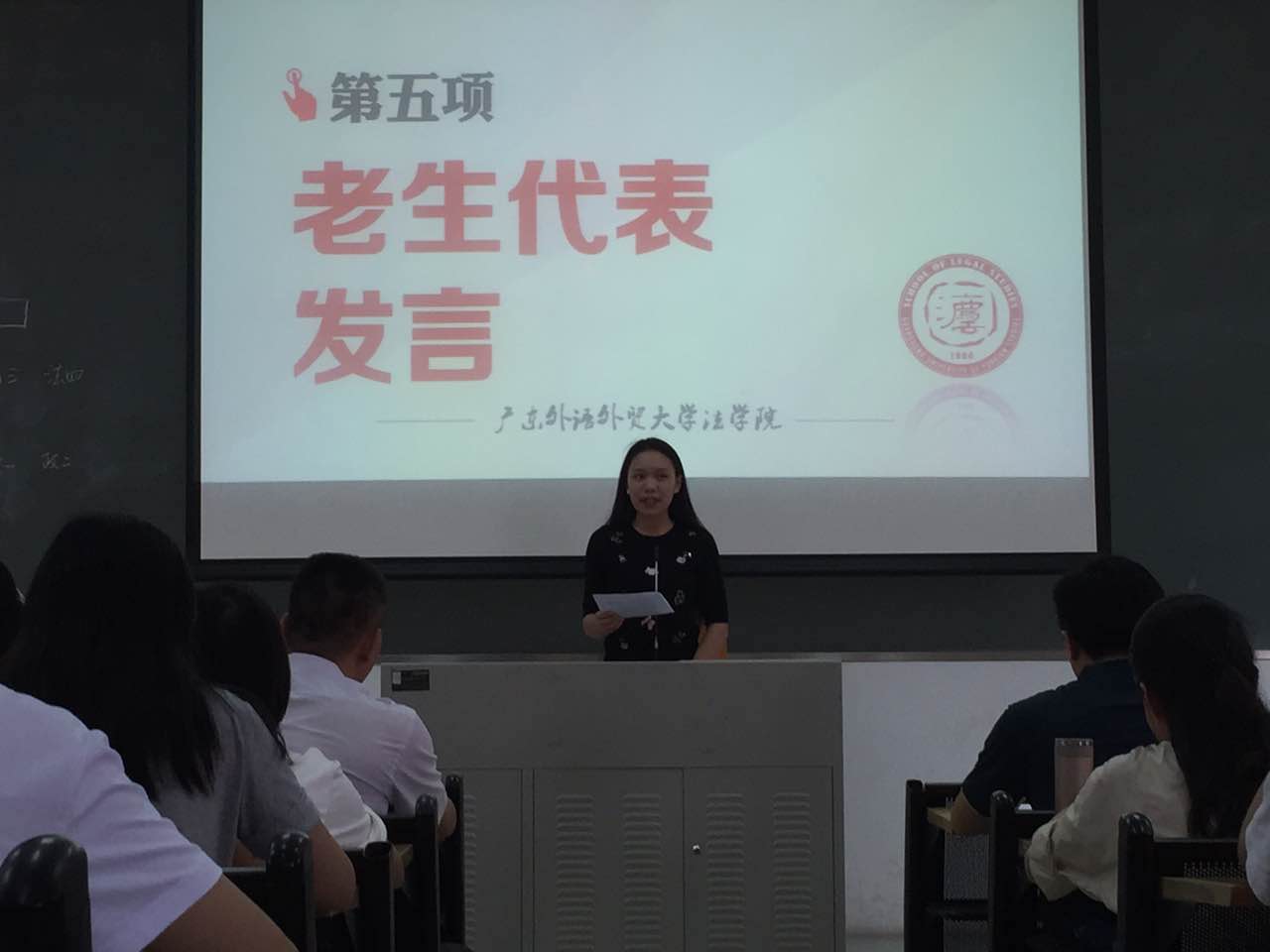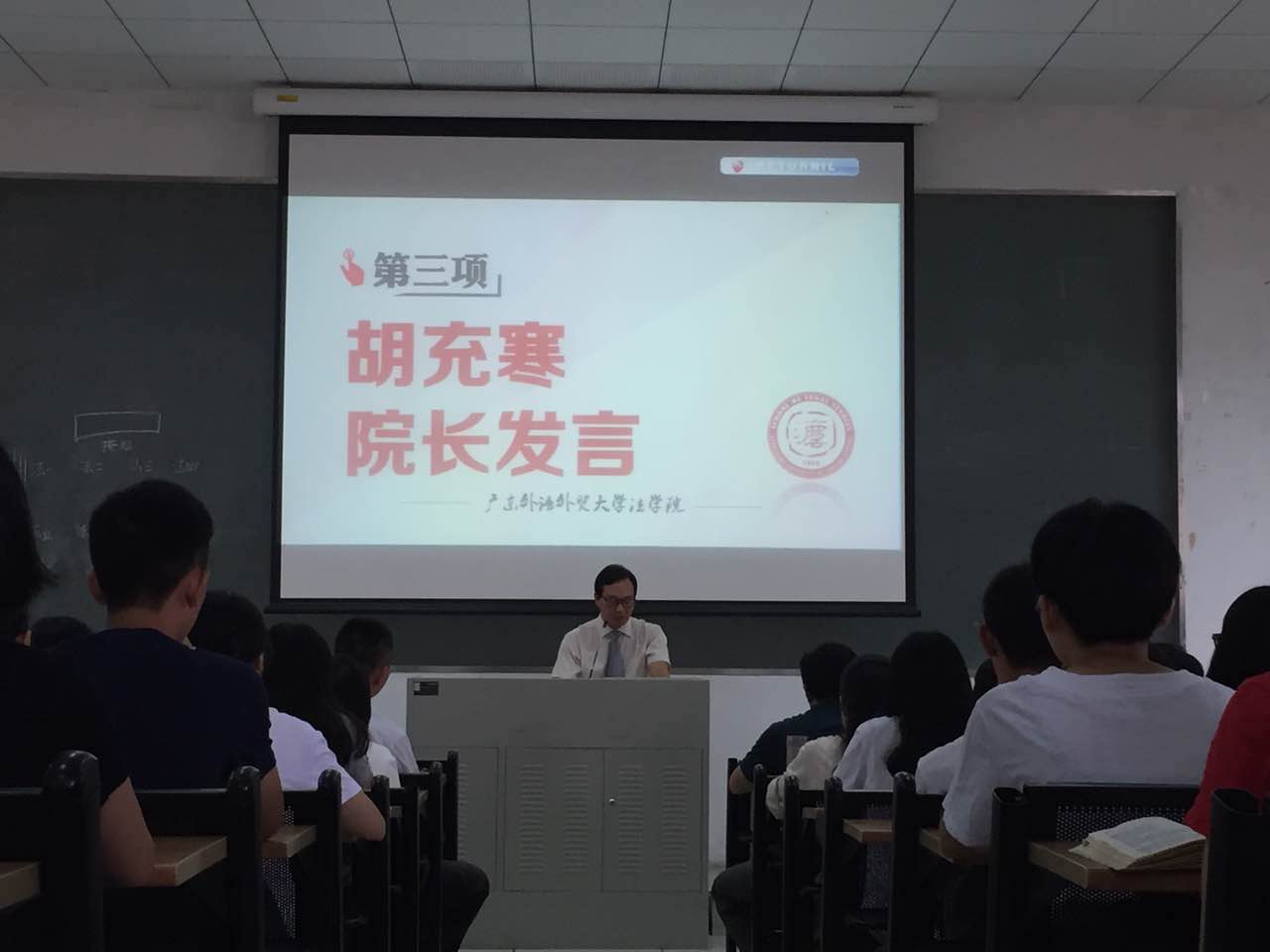 在全体奏唱国歌之后,胡充寒发表讲话。首先,他强调法律人是社会公共道德的捍卫者;其次,在大学,最重要的是要有健全良好的品格;紧接着,他通过与其他高校法学专业对比,总结出广外法学的特色:外语水平高,国际化特色鲜明,由此他建议同学们要加强外语学习,提升外语能力,追求综合全面发展;此外,他要求同学们要目光长远,不能将眼光局限在分数,要有家国情怀,联系国家与社会,“选择的不仅仅是一项专业,更是一项事业。”最后他表达了对学生的美好祝愿:从优秀到卓越,成为国家社会栋梁之材。之后,教师代表杨浩楠也进行了发言,分享了自己的教学经验。
