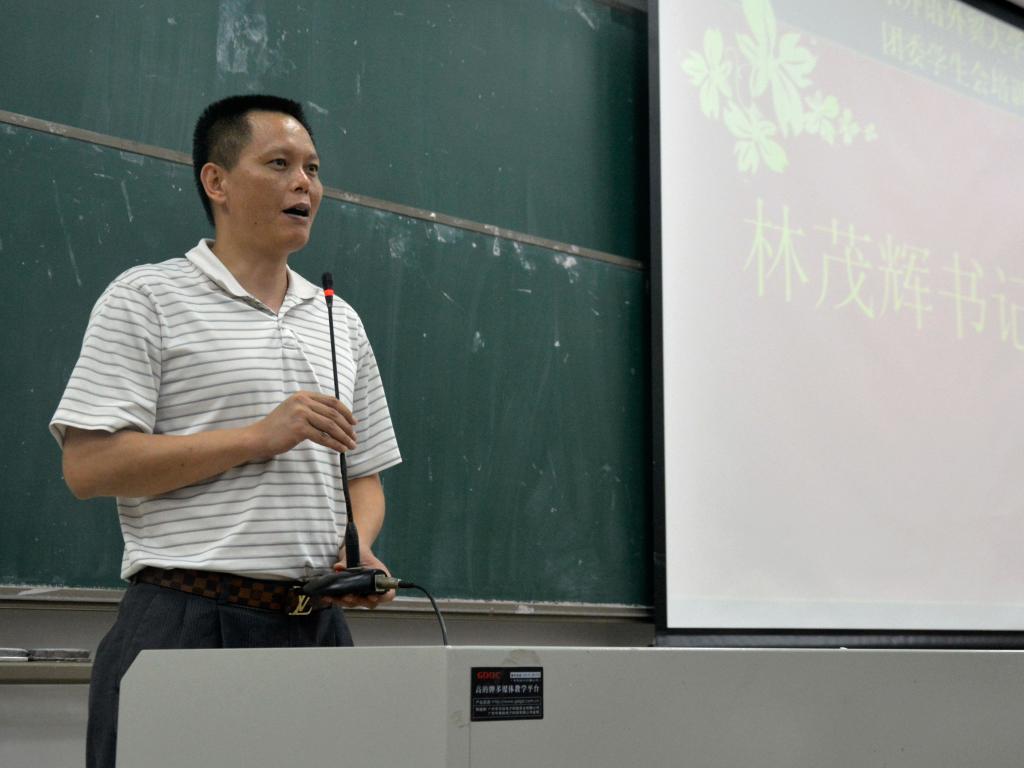 党委书记林茂辉发表讲话,指出团学发展方向及存在问题。首先,他对新老团学成员们表达了衷心的感谢。承本次大会主题,他提出要重视培训,继承党的优良传统。接着他强调纪律,并以篮球的协作为例子阐明了团队精神的重要性,希望团学能和谐融合,幸福工作。最后,他提出要求及期望,成员们争取在未来一年夺得红旗团委和红旗学生会。