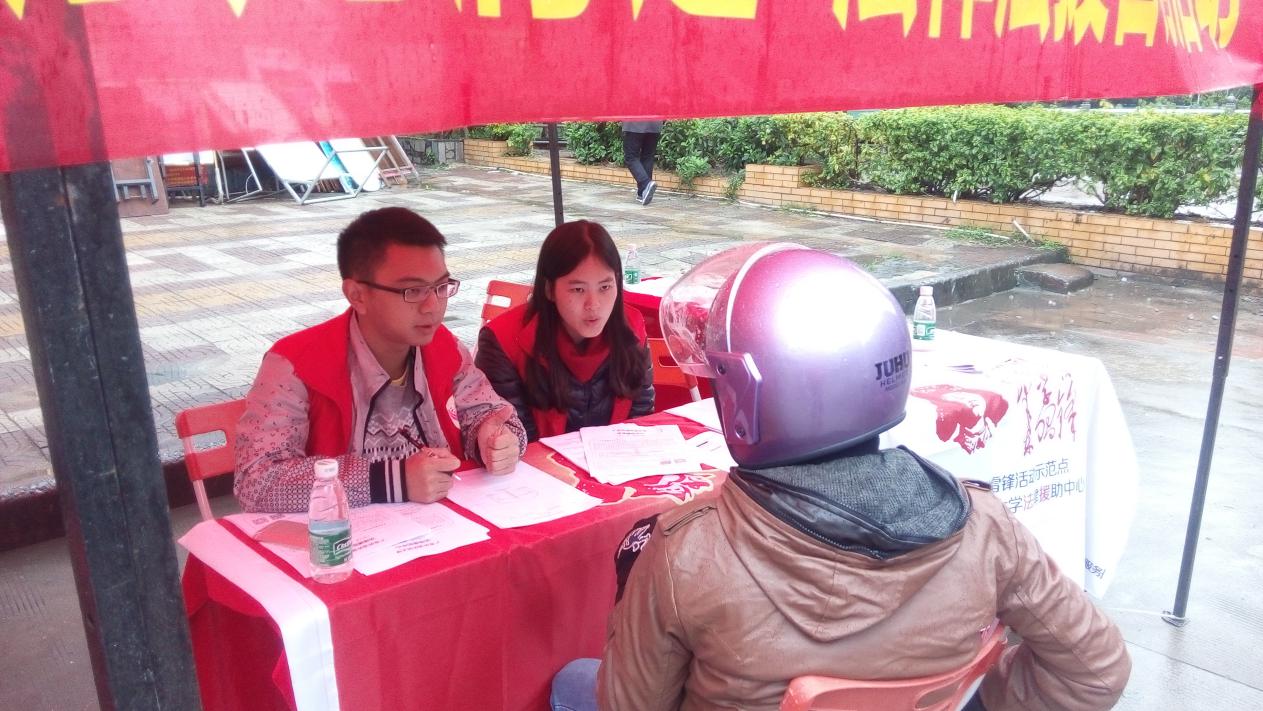 冒着严寒与风雨,法援志愿者简单地布置好现场,开始了本次无偿法律咨询活动。本次咨询活动负责解答的志愿者主要为法学大三级本科生,同时法援中心主任叶昌富老师提供指导。
