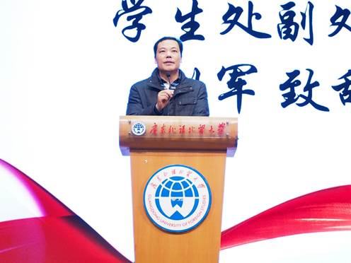在致辞环节,学生处副处长刘军从“坚持”“方法”“创新”“调适”等方面出发提醒学生要摸索“适合自己的学习方法”,“学会独立思考”,“培养创造性思维”,同时要“正确看待竞争,调整心态积极融入校园生活”。