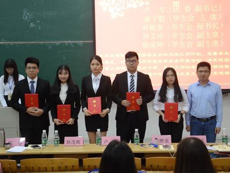 接下来,主持人公布2016-2017年法学院团委学生会优秀部门名单,林茂辉为优秀部门部长颁发奖状,借此激励各优秀部门可以再接再励。而后,林映泉为大家介绍了团委学生会的基本架构、工作宗旨、工作作风及团学口号,并详细介绍了团学各个部门的基本工作内容及职能。紧接着,陈宇为新一任主席团成员颁发聘书,卢方与谢子聪为新一任部门的正副部长颁发聘书。