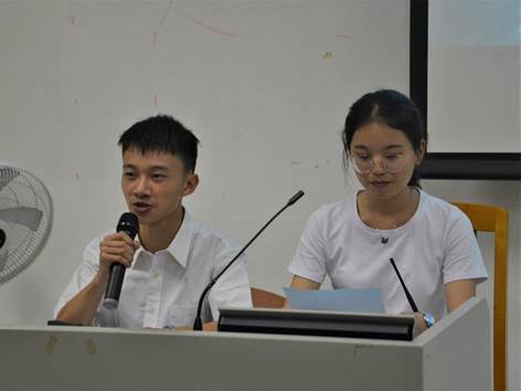 在17级红旗团支部评比活动中,廖伟智首先致辞。他充分肯定了班干部及同学们在主题团日活动等一系列班团组织建设中的努力和付出;他指出,大学阶段有许多评选项目,这些评比可以成为自己付出过的“证明”,亦可成为将来求职升学的优势;最后,他希望参评的各位可以秉承公平、公正的态度来完成评比活动。