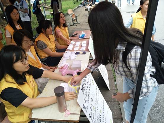 志愿者指引学生到活动摊位