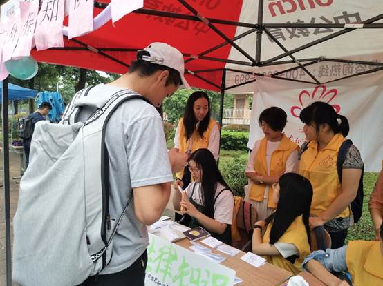 志愿者们在校道派发传单,以吸引更多的学生到摊位,不同学院的学子陆陆续续来到摊位前过五关斩六将。此外,在摊位的右侧设有法律咨询处,由法学院的师兄师姐在旁进行法律知识普及、解答同学们对法律知识的困惑,以便前来的学生学习到更多的法律知识。