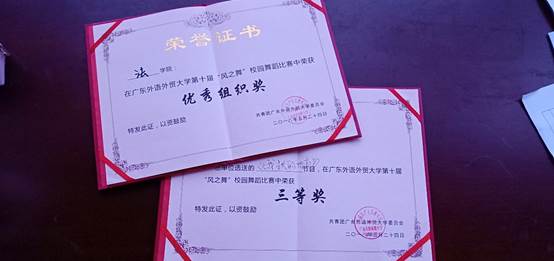 本网讯(文字:肖嘉颖 摄影:徐孟焱 )为了积极参与国家精神文明建设,展现当代大学生风采,同时进一步繁荣校园文化,推动校园文化建设,丰富同学们的课余艺术文化生活,2018年5月24日晚,在由校团委举办的第十届“风之舞”校园舞蹈大赛中,我院队伍表演的舞蹈《我生长的地方》取得了三等奖,法学院荣获优秀组织奖。