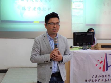 本网讯(文字:叶家鸿 摄影:杜云钰 ) 11月29日下午,由广东外语外贸大学法学院、广东省知识产权维权援助中心主办,广东外语外贸大学法学院团委学生会、法学院Care志愿者协会、保护知识产权服务队承办的法学院保护知识产权专题讲座在实验楼B107顺利举行。本次讲座旨在提高学生保护知识产权的意识、让同学们了解我国目前有关知识产权保护的现状。本次讲座的主讲人为法学院的卢纯昕讲师。出席本次活动的嘉宾有法学院团委书记陈宇、学生会副主席彭嘉铭及实践部部长赖萍。