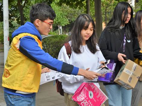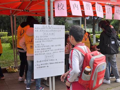 志愿者们通过在校道派发传单的方式吸引更多的学生参与普法活动,不少学子被宣传单吸引,来到摊位前闯关。