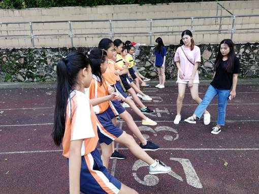 与此同时,体育课教学在操场有秩序的进行着,这节课的内容是走正步。队员陈晓欣带领学生们在烈日下走正步,部分队员在旁边指导,维护课堂秩序。在阳光的照耀下,队员们不忘初心,耐心教学,显得更加朝气蓬勃,青春向上,展现了广外学子的良好精神风貌。