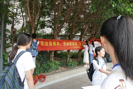 本网讯7月12日上午,法学院与法为伍服务队与筑梦服务队的普法组到达普法地点——北湖广场,并与当地司法所联合,开展了以“宪法是根本,劳动需保障,法治在发展”为主题的三下乡校外普法活动。活动面向江门市广大市民展开。