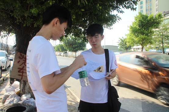 在调研走访的开始,“凝光”三下乡服务队调研组选择了人流量较大的公交车站进行问卷派发。有的居民表示,自己对英德的街道卫生并不了解,有的居民则因为天气炎热、害怕错过公车等原因都拒绝了调研组的问卷调查。问卷派发的一开始,调研组的工作并不顺利。