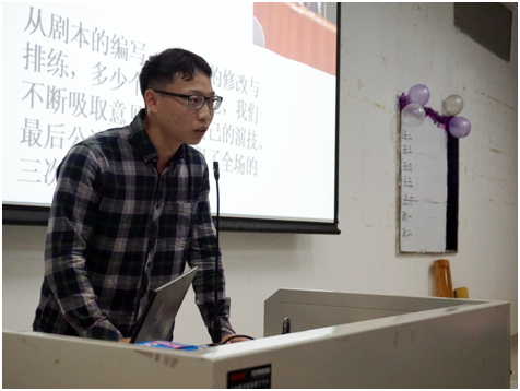 相比起其他班的展示,政二的展示更加引人注目,他们通过新闻播报的方式来展示他们班的传奇之路。台上的两位“新闻发言人”向我们“播报”了他们院运会、红晚、团日活动、男生节、女生节活动等的情况。富有创意的展示方式、搞怪诙谐的语言惹得现场观众哈哈大笑。而压轴出场的法四则重点述说了他们班的院运会、红晚和团日活动中得到的收获和发现的不足。他富有特色的讲话方式同样活跃了现场气氛。