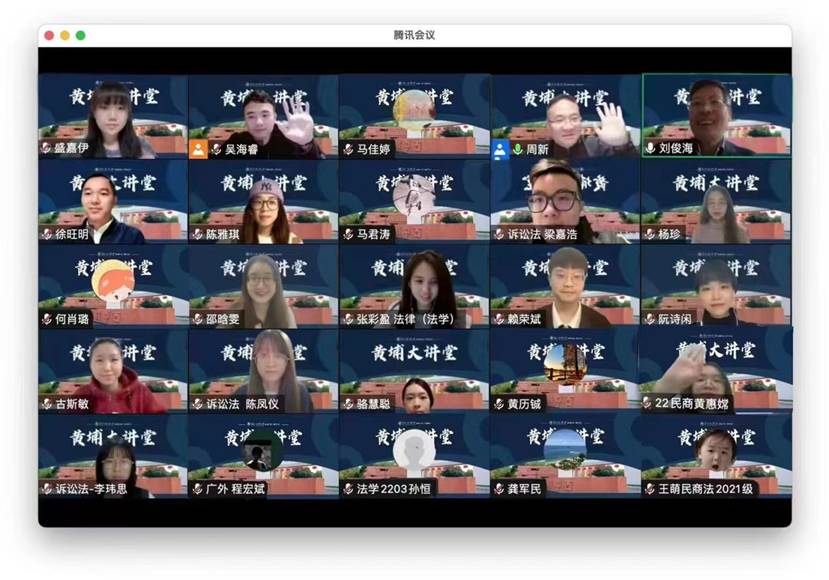 2022年12月2日,由广东外语外贸大学法学院主办的黄埔大讲堂“公司法修改中的热点争点疑点难点问题”通过腾讯会议线上召开。本次讲座由中国人民大学法学院教授、博士生导师、商法研究所所长刘俊海教授主讲,我校法学院博士生导师周新教授主持,300余名师生共同参与。在讲座正式开始之前,我校法学院院长陈云良教授致辞,感谢刘俊海教授莅临广外法学院指导交流,并希望广外法学学科不断向前发展。主持人周新教授对刘俊海教授、受邀参与以及与会的广大师生表示欢迎和感谢。