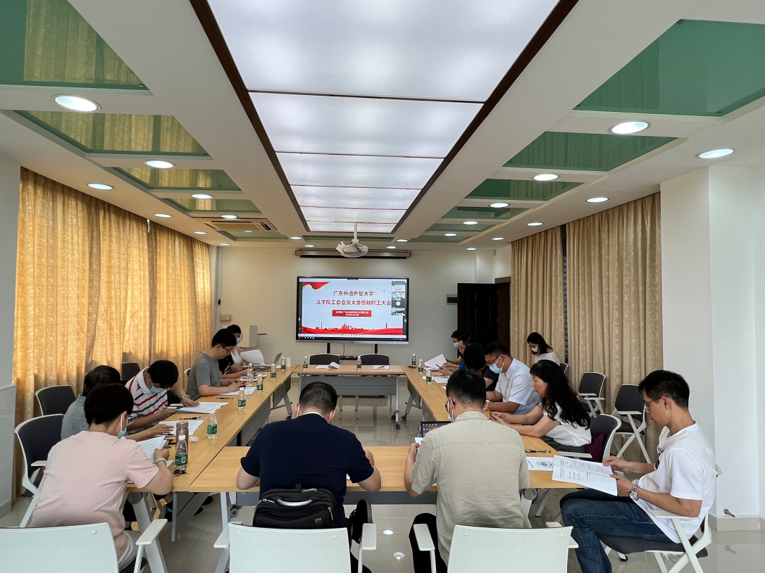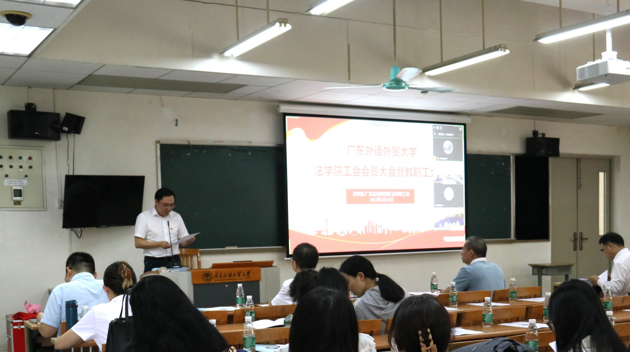 2023年5月18日,广东外语外贸大学法学院工会会员大会暨教职工大会在大学城校区(主会场)、白云山校区(分会场)和知识城校区(分会场)同步召开。校党委常委、副校长刘海春和法学院工会全体会员、法学院和广东法治研究院全体教职工出席大会,大会由法学院党委书记杨敏生主持。