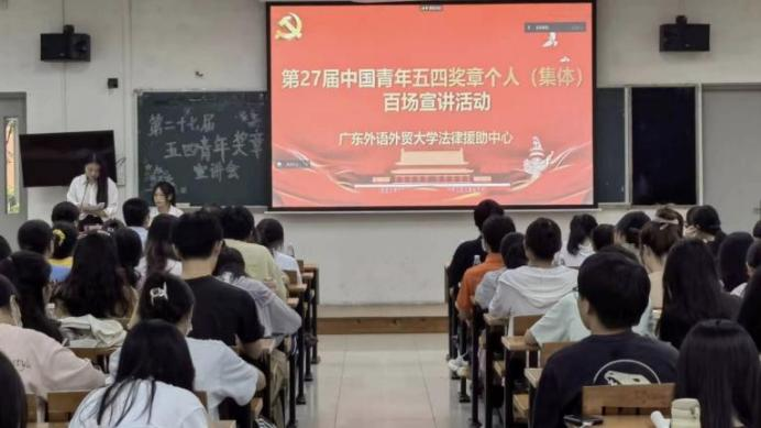 为积极响应党对广大青年的号召,深入贯彻习近平新时代中国特色社会主义思想,发挥青年五四奖章的荣誉位阶标杆作用与思想政治引导价值,6月8日下午,第25届广东青年五四奖章获奖集体广东外语外贸大学法学院法律援助中心(以下简称广外法援)在大学城校区开展了第27届中国青年五四奖章宣讲活动。本场活动以线上与线下相结合的方式,通过讲述法援党支部的发展历程,展示新时代团员青年的奋进精神。法学院党委副书记范聪、学院办公室主任陈宇、学院团委书记陈雪桃出席活动。我校各级团组织青年代表现场聆听宣讲。