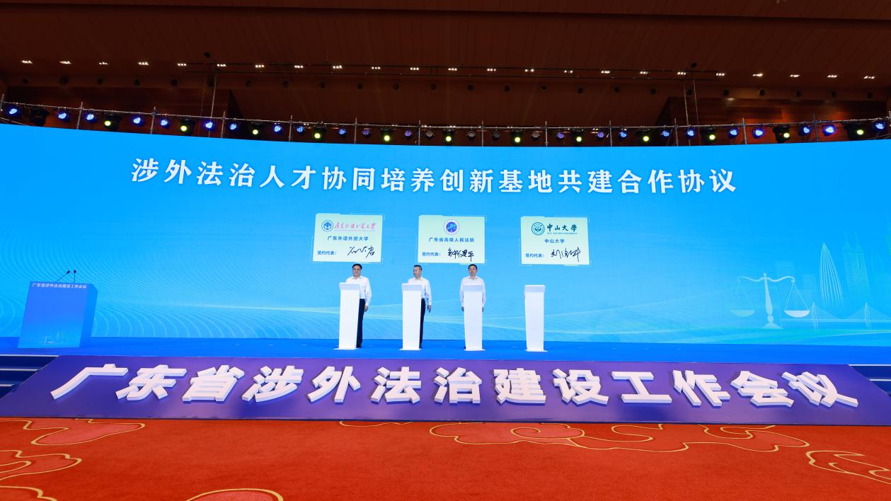 为整合各方优势资源,积极打造服务国家涉外法治战略和广东高水平对外开放的涉外法治人才培养基地,省司法厅、教育厅与广外签署《合作共建广东省涉外法治人才教育培养基地协议》,省法院与广外签署《涉外法治人才协同培养创新基地共建合作协议》。